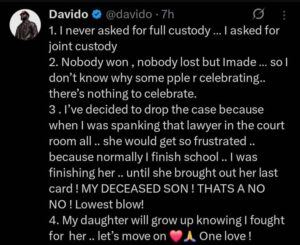 In the end, singer Davido has dropped the custody case, making it clear that his focus is on his daughter. Despite the courtroom clash and heated exchanges, he emphasized that the battle was about ensuring she knows he fought for her.